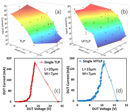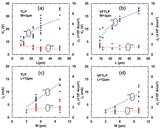 The impacts of the dimensions of graphene ribbons on the ESD handling capability were studied, with the measured statistics shown in Figure 19. Figure 19a shows the statistics for the critical (ESD failure) voltage VC and the critical current density JC related to the length of graphene ribbon samples (at fixed width) in the TLP test. It is readily observed that VC monotonically increases as L increases because of the increased resistance. JC seems to be unaffected by L because IC is normalized to W. Similar trends are observed for GR samples subjected to stress in the VFTLP test, as depicted in Figure 19b. Figure 19c shows the statistics for IC and JC related to the width of graphene ribbon samples (at fixed length) in the TLP test. It is clear that IC increases as W becomes wider because of the reduced resistance, while JC is unaffected by W. Similar trends are observed for GR samples subjected to stress in the VFTLP test, as depicted in Figure 19d.