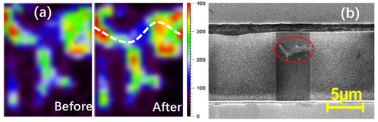 The ESD failure mechanism of GR wires was studied using time-resolved Raman spectroscopy by continuously subjecting GR samples to stress using the TLP method until ESD failure would occur. Figure 20a shows the Raman scanning image for a GR sample before and after TLP zapping; the Raman D-peak intensity is an indicator of defect accumulation within the stressed GR wire. The process of ESD failure development is readily observed in Figure 20a, showing that, before TLP stress, defects are mainly located along the boundaries of CVD-generated graphene, while after being subjected to TLP stress, defect localization occurs, leading to the formation of a fault line across the graphene ribbon wire (the white dashed line). It has been recently suggested that the study of the intensity ratio of G and D peaks can reveal more details on graphene reliability [20]. Figure 20b shows the failure signature of a graphene ribbon wire subjected to stress via TLP, in which the presence of a crack (red dashed circle) indicates the ESD failure signature.
