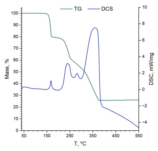 Thermogravimetry (TG) study jointed with differential scanning calorimetry (DCS) and mass-spectral (MS) detection of volatile decomposition products has shown that decomposition of Mn(acac)3 undergoes in 4 stages (Figure 1). Initially, about 20% of sample mass was lost rapidly in the temperature range of 140–160 °C that could be accounted for by one acetylacetonate-ligand loss and substituting it by oxo- or hydroxylic groups. During the next two slower stages (200–380 °C), nearly 75% of the weight was lost due to the formation of MnO2 mixed with the remaining carbon. Finally, in the last stage, it is slowly oxidized by air, which is proved by the appearance of a CO2+ (m/z = 44 g/mol) signal at a temperature above 380 °C. As demonstrated by DCS data, stages 1–3 are exothermic, and the latter one is endothermic.