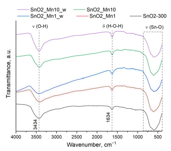 Fourier transforms infrared (FTIR) spectra of blank SnO2 and SnO2/MnOx powders (Figure 2) show the absence of characteristic bands for C-H-O organic compounds. The only strong absorption bands presented on these spectra correspond to the crystal structure Sn-O vibrations (400–870 cm−1), adsorbed water (1634 cm−1) and hydroxyl groups (3000–3670 cm−1) [24]. So, one can accept that Mn(acac)3 decomposes completely during the 24 h annealing of SnO2 impregnated with manganese (III) acetylacetonate.