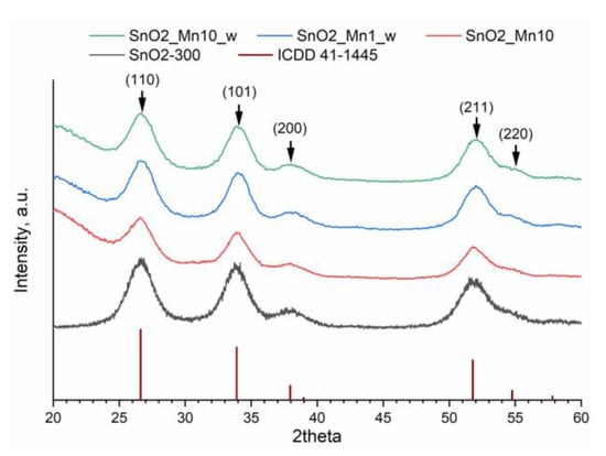 As shown by the X-ray diffraction (XRD) study, synthesized tin (IV) oxide is single phase and matches cassiterite (rutile-type) structure (ICDD 41-1445). As for SnO2/MnOx composites, no new crystalline phases were found even in the SnO2_Mn10 sample (Figure 4), which agrees with known data [11]. The size of the coherent scattering region (crystalline grain size, dXRD) calculated by the Scherer equation is 3–4 nm for SnO2-300 and slightly larger for SnO2_Mn10 (4.5–5 nm) and etched materials (4–4.5 nm).