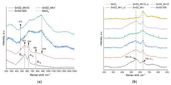 However, strong absorption of laser radiation causes such problems as a lack of Raman signal and sample overheating, which leads to a shift of Raman bands and an increase in background signal. When using a 532 nm laser as a radiation source, the SnO2_Mn10 sample and reference manganese dioxide spectra were uninformative because of the abovementioned problems. However, high-quality spectra were obtained for whiter samples with lower manganese content (Figure 5a).