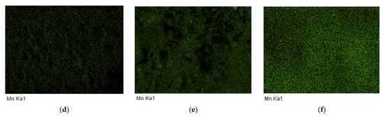 SEM images of SnO2_Mn10 sample at different magnifications: (a) ×102; (b) ×103; (c) ×105; and manganese distribution EDX maps of SnO2_Mn10 sample at same magnifications: (d) ×102; (e) ×103; (f) ×105.