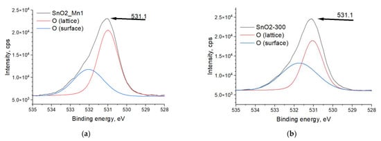 XPS spectra of (a) SnO2-300 and (b) SnO2_Mn1 in the O 1s region. The «O (lattice)» curve corresponds to the main peak, and «O (surface)»–is the minor peak.
