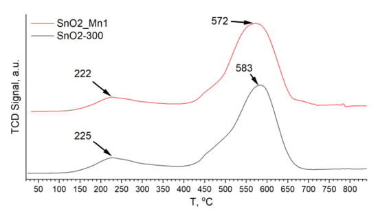 The manganese-modified material has a smaller contribution from the reduction of chemisorbed oxygen to the uptake of hydrogen by the sample, which agrees with XPS results. The total amount of hydrogen consumed during the reduction of the samples is less than the theoretical value n(H2)/n(SnO2) = 2, corresponding to the reduction of stoichiometric SnO2 to Sn0. This may be due to the high defectiveness of tin dioxide obtained at a low annealing temperature of 300 °C.