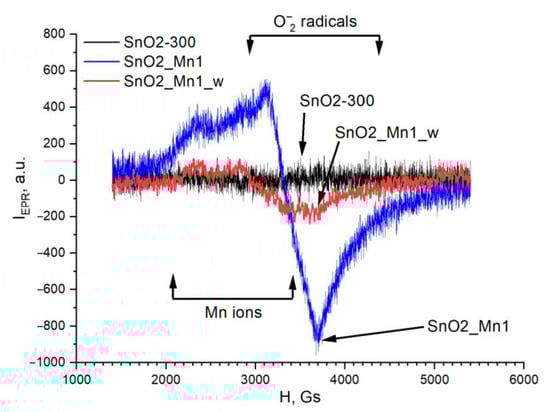 The EPR spectrum of unmodified SnO2 does not demonstrate the signals related to superoxide radicals and manganese ions (Figure 10). The spectra of sample SnO2_Mn1 are a superposition of the EPR signals of manganese (III) ions (or manganese ions in other oxidation states) and oxygen radical anions O2− (g1 = 2.02, g2 = 2.009, g3 = 2.003). The observed lines in the spectra are strongly broadened due to dipole-dipole and/or exchange interactions. Moreover, the hyperfine splitting caused by the interaction of an unpaired electron with the paramagnetic (I = 5/2) nucleus of the manganese atom contributes to the broadening of the EPR signal of manganese ions.