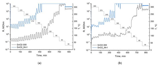 Resistance curves of SnO2-300 and SnO2_Mn1 during the cyclic test gas composition change at different temperatures when detecting: (a) 20 ppm CO; (b) 4 ppm NO.
