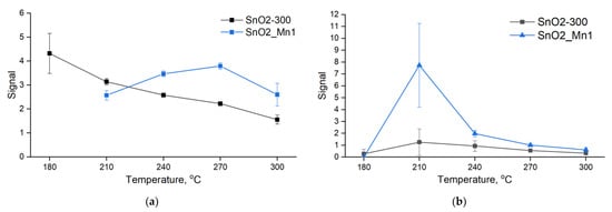 Temperature dependence signal curves of SnO2-300 and SnO2_Mn1 when detecting: (a) 20 ppm CO; (b) 4 ppm NO.