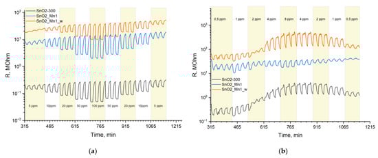 Resistance curves of SnO2-300, SnO2_Mn1 and SnO2_Mn1_w during the cyclic test gas composition change at different gas concentrations to detect: (a) CO; (b) NO at 270 °C.
