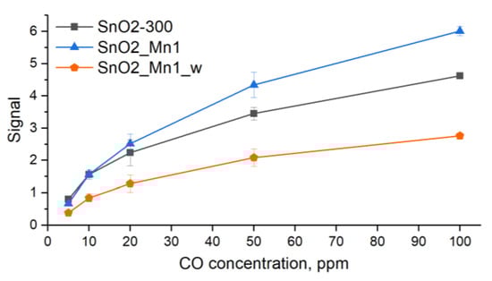 During the cyclic test gas composition, the signal concentration-dependence curves of SnO2-300, SnO2_Mn1 and SnO2_Mn1_w change to detect CO descending from 100 ppm to 5 ppm.