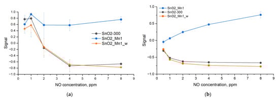 Signal concentration-dependence curves of SnO2-300, SnO2_Mn1 and SnO2_Mn1_w during the cyclic test gas composition change when detecting NO at 270 °C: (a) ascending from concentration from 0.5 to 8 ppm, (b) descending concentration from 8 to 0.5 ppm.