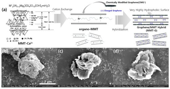 Finally, organo-MMT was added to ethanol and stirred for 30 min with a homogenizer to prepare a 5 wt% dispersion. The CMG+ colloid was then further modified by the addition of different amounts of graphene (0.1 wt% (MMT-0.1G), 0.5 wt% (MMT-0.5G), 1.0 wt% (MMT-1.0G), and 3.0 wt% (MMT-3.0G)) and stirred with a homogenizer. During this process, adsorption via self-assembly occurred via electrostatic attraction. After the adsorption process, the coprecipitated materials were filtered under reduced pressure, separated, washed with ethanol, and dried for 24 h in an oven at 60 °C to obtain the MMT-G nano-hybrids.
