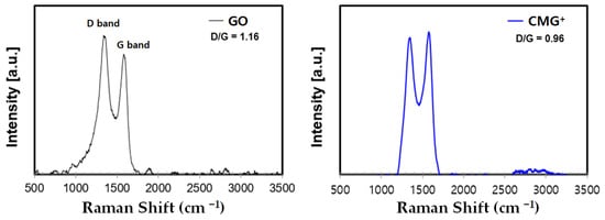 Figure 2 shows the Raman spectra of GO and CMG+, which are used to assess the structural features of the functionalized graphene used to fabricate MMT-G. Crucially, Raman spectroscopy is considerably useful for the analysis of graphene-containing materials. In particular, the disorder (D) peak (1360 cm−1) represents defects in the sp2 crystal structure of graphene, whereas the graphite (G) peak (1580 cm−1) represents the ordered (non-defective) C=C bonds and arises because of the vibrations of neighboring atoms in the hexagonal structure in the opposite direction [19]. Figure 2 shows the Raman spectra of GO and CMG+, and characteristic D and G bands are visible. Further, the intensity of the D band is high, probably as a result of functionalization. The D/G intensity ratio of GO is 1.16, whereas that of functionalized graphene (CMG+) is calculated to be 0.96, indicating that the structural defects are reduced via reduction and functionalization.