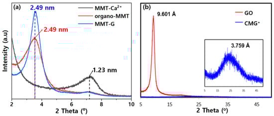 XRD patterns of (a) MMT-Ca2+, organo-MMT, and MMT-G and (b) GO and CMG+.