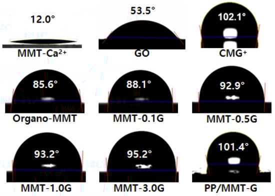 Contact angle measurements of MMT-Ca2+, GO, CMG+, organo-MMT, MMT-G (graphene contents of 0.1, 0.5, 1.0, and 3.0 wt%), and the PP/MMT-G nanocomposite.