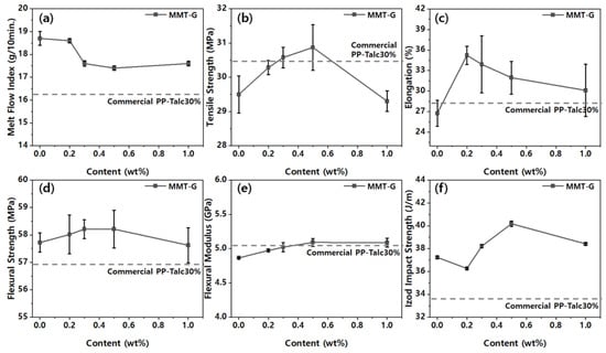 Figure 7 shows the mechanical properties of the PP nanocomposites in terms of the MMT-G content. As described earlier, MMT-1.0G (graphene content of 1.0 wt%) was used, and the standard used for mechanical property evaluation was commercial PP-30 wt% talc composite (data are shown by the dashed line in Figure 7).