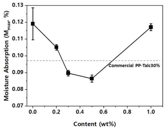 Figure 8 shows the Mmax (maximum moisture absorption) of the PP nanocomposites with respect to the nanofiller content. Because of the hydrophobic properties of MMT-G and the interruption to the water diffusion path, the moisture absorption decreased with the increase in the MMT-G content. Specifically, for the PP/MMT-G nanocomposites, the moisture absorption decreased at low filler contents and then increased rapidly at significantly high filler contents (i.e., higher than 1.0 wt% MMT-G). This is because although the hydrophilicity of MMT is suppressed by the graphene coating, the hydrophilicity ratio (silicate ratio) increases above a certain level.
