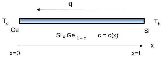 The system considered here is a rigid nanowire of length L, with composition varying along its length. More precisely, we consider a silicon-germanium alloy, which will be denoted by , with the stoichiometric variable c dependent of the position x of the points of the system, and such that and . Thus, for we have pure germanium, and for we have pure silicon. In the intermediate points, namely for , the composition c depends on the function , which is determined while manufacturing the material. The easiest situation, which will be considered in the present paper, is the linear dependency on x, namely . Different graduation laws have been analyzed in Ref. [8]. Among the many practical applications of alloys, of particular interest in micro/nano-electronics is the heat rectification, namely, the fact that the same temperature gradient but acting in opposite directions on a given system yields different values of the corresponding heat flux [9].