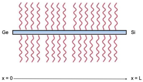 Here we consider a different way to control the rectification of the heat flux, namely, by heating the internal points of the body by a heat source , with as the mass density. Coleman and Noll, in their celebrated article on the thermodynamics of elastic materials [17], call r “density of absorbed radiation”, and claim that is “the heat supply per unit mass and unit time absorbed by the material and furnished by radiation from the external world”. One of the possibilities for obtaining such an additional heat supply is to put the system in a radiation field [18]. At the nanoscale, radiative heat can be supplied to the system by placing it in an electromagnetic radiation generator. Figure 2 schematizes a nanowire of length L immersed in a field of thermal radiation.