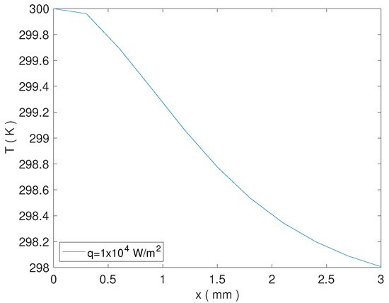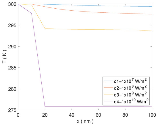 Finally, for the reduction factor is , while the heat flux applied is 10 times stronger with respect to the last case. The combination of both these factors produces a drastic reduction in the values of the temperature (see the violet line in Figure 3).