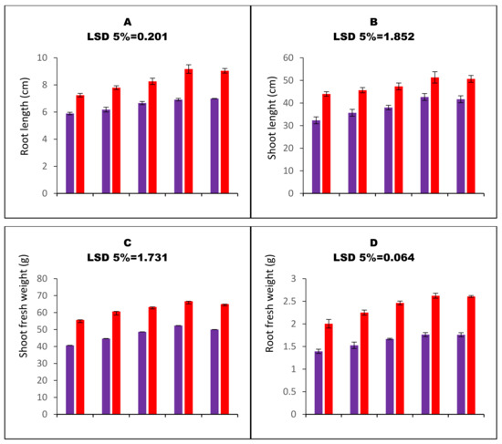 All the studies’ growth parameters were decreased upon the imposition of water stress. Water stress decreased the root length, shoot length, shoot fresh weights, and root fresh weights of carom plants by 18.6%, 26.5%, 26.9%, and 30.4%, respectively, compared to respective control treatment. However, the seed priming (SP) resulted in better growth and biomass characteristics of carom plants. The 75 ppm priming concentration enhanced the root length, shoot length, shoot fresh weights, and root fresh weights of water-stressed carom plants by 17.3%, 31.9%, 28.6%, and 26.5%, respectively (Figure 2A–D).