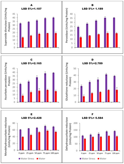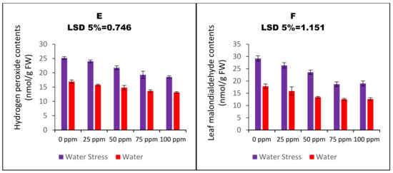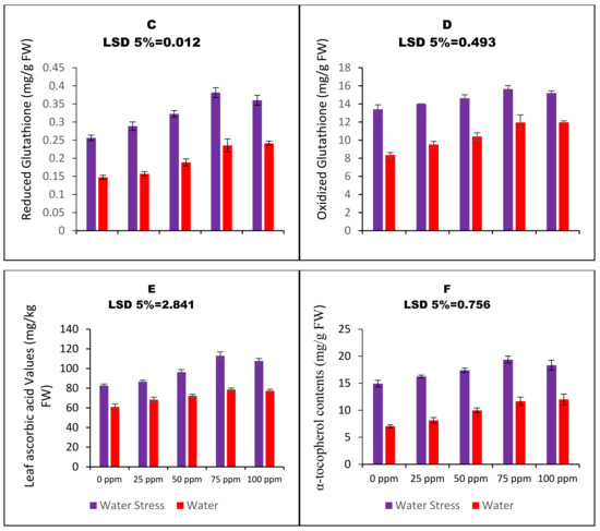 Water stress resulted in the elevated vitamin antioxidants status of carom plans. The activities of α-tocopherol and ascorbic acid were assayed as a part of the experimental plan. The carom plants raised through 75 ppm CaO_NPs primed seeds experienced enhanced ascorbic acid contents by 22% and that of α-tocopherol by 26%. The effect of SP was significant under both water-stressed and well-irrigated plots (Figure 3E,F).