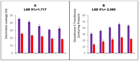 To determine the activity of glutathione S-transferase, the method described by Hasanuzzaman and Fujita [31] was used. The reaction mixture was prepared by adding 100 mM Tris-HCl buffer (pH 7.0), 1 mM GSH, 1 mM 1-chloro-2,4-dinitrobenzene (CDNB), and enzyme extract. The reaction was initiated, and the absorbance of the mixture was measured at 340 nm using a spectrophotometer (Beckman 640 D, Brea, CA, USA).