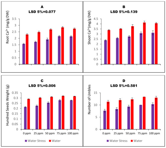 Water-stressed carom plants were poor in uptake of Ca2+, as lower water availability resulted in reduced root and shoot Ca2+ acquisition, i.e., by 31.7% and 29.7%, respectively (Figure 5A,B). The plants raised through CaO_NPs primed seeds were better in Ca2+ contents under both irrigation regimes. SP with 75 ppm CaO_NPs increased root and shoot Ca2+ contents by 38% and 29.4%, respectively, in the water-stressed carom plants. Likewise, the plants raised through CaO_NPs-mediated SP were better in measured yield parameters such as the number of umbels and seed weights. Water stress resulted in a 32% decrease in the number of carom umbels and 26.3% decrease in hundred seeds weight. SP with a 75 ppm concentration of nano calcium oxide increased the number of umbels and hundred seeds weights of water-stressed carom plants by 30.4% and 30.3%, respectively.