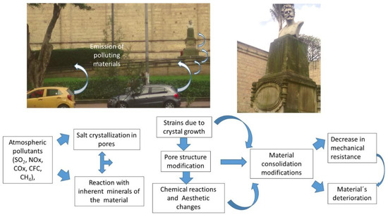 Among the anthropic factors that most contribute to the deterioration of cultural works are those produced by the emission of toxic gases emitted by vehicles in urban areas, whose particles can be deposited on surfaces, causing dark spots that end up conducing to aesthetic damage [58], as shown in a site placed in front of a museum (Figure 1). The constant emission of these products into the environment could turn out to be uncontrollable.