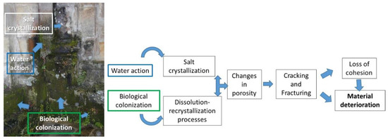 The main mechanisms directly affecting the historical materials are those produced by environmental [51] or anthropic [52] action. These factors increase the deterioration caused by aggressive agents that destroy architectural, sculptural, archaeological, paleontological, or pictorial materials [53,54,55,56,57].