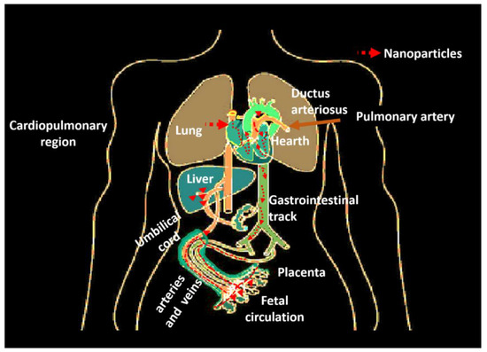 Details of the cardiopulmonary region showing how nanomaterials cross the alveolar-pulmonary epithelium and reach the interstitial zones, reaching the circulatory and lymphatic system, distributed throughout the body. In pregnant women, some nanoparticles can reach the placenta and affect the fetus.