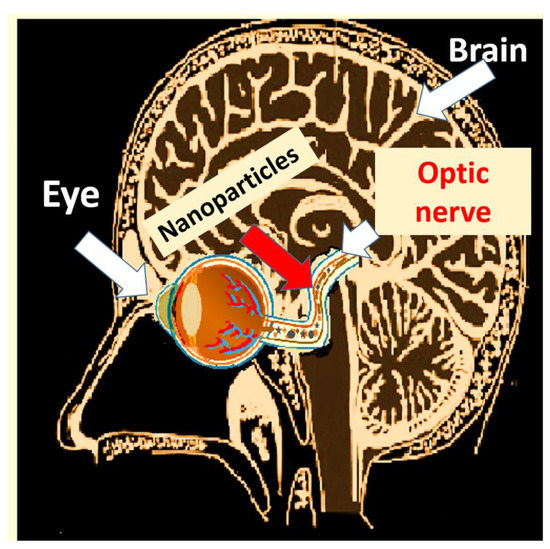 Translocation is the mechanism of entry into the body of nanomaterials [268]. These can cross biological barriers and reach areas of the body other than the entry route, depending on their solubility [269]. For instance, in the case of the inhalation route, they cross the pulmonary alveolar epithelium, reach the interstitial areas, and reach the circulatory system, distributed throughout the body [270] (Figure 4). Another example is that the nanomaterials captured at the nasal level can access the brain via the olfactory nerve (Figure 5).
