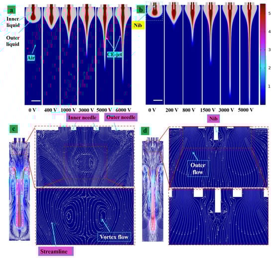 - Lim, L.K.; Hua, J.; Wang, C.H.; Smith, K.A. Numerical Simulation of Cone-Jet Formation in Electrohydrodynamic Atomization. AIChE J. 2011, 57, 57–78. [Google Scholar] [CrossRef]