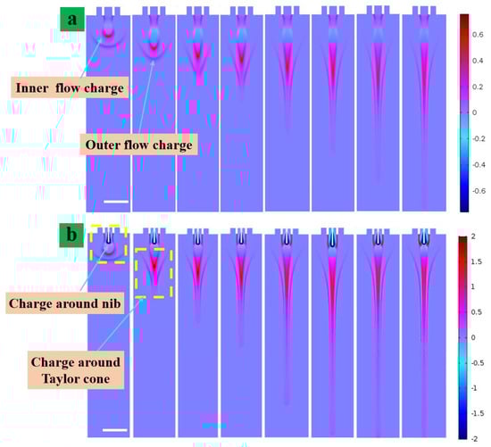 4.2. Space Charge Density of the Coaxial Cone Jets