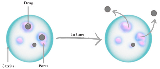 The ability to achieve targeted therapy as well as sustained and controlled release of the drug is possible through the use of drug delivery systems (DDSs). It is a hot spot in the medical field understood as a combination of drug and carrier, where the drug is loaded inside or on the surface of the carrier by chemical or physical methods [1]. In general, drug carriers are understood as safe tools for transporting molecules for nutraceutical, pharmaceutical, and cosmetic applications [2]. In recent years, many inorganic nanomaterials such as gold nanoparticles [3,4,5], carbon nanotubes [6,7,8], and quantum dots [9,10,11] have been extensively studied for drug delivery. In the context of bone tissue regeneration, ceramic carriers based on bioactive calcium phosphates (CaPs) are of great interest. One of the advantages of ceramic carriers is their low toxicity. Most CaPs have good biocompatibility, biodegradability, as well as biological stability [12]. Furthermore, the variety of ceramic materials as well as the methods of their synthesis make it possible to adjust the size and structure of the grains. It is therefore possible to adjust these parameters for drug loading, for example, in the nanometer size [13]. Figure 1 presents the principle of ceramic drug carrier operation. The diffusion of drugs and other active substances through the pores of ceramics depends on their concentration gradient and solubility. The porosity of the ceramic carrier itself, as well as the specific surface area and size, affect drug diffusion [14,15].