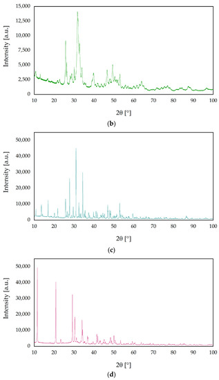In order to perform structural characterization of the ceramic powders obtained, X-ray diffraction analysis was performed using a Malvern Panalytical Aeris X-ray diffractometer with PIXcel1D-Medipix3 detector (Malvern, UK) with Cu Kα radiation. All measurements were carried out at a step size of 0.0027166° 2θ over a range of 2θ from 10 to 100° with a time per step of 340.425 s.