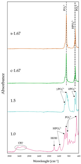 The Ca/P molar ratios for the powders and the determined elemental contents of calcium and phosphorus (wt. %) are presented in Table 2. The determined Ca/P molar ratios differ slightly from the assumed values. In the case of s-1.67 and c-1.67, the values obtained are very close to the stoichiometric HA, which is assigned a value of 1.67. The slight discrepancies that can be observed for all synthesized samples may be due to the incorporation of foreign cations or anions into the atomic structure of the ceramics. The reactions were carried out in an air atmosphere; hence, substitutions of, for example, phosphate groups by CO3 2- ions are possible.