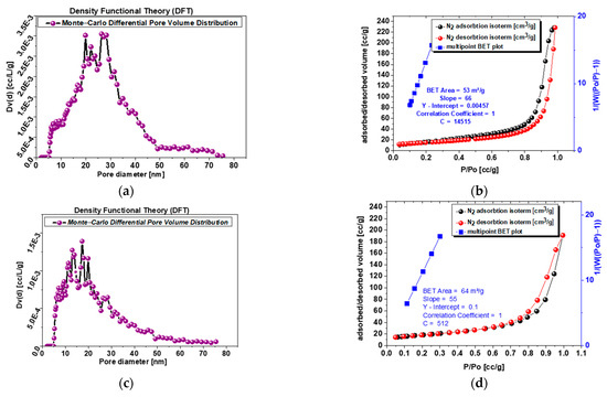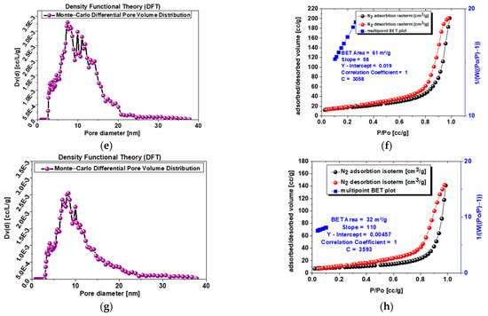 (a) Sample s-1.67 mesopore size differential distribution according to DFT (Dv(d) [cc/L/g]; (b) sample s-1.67 adsorption–desorption isotherms and multipoint BET plot; (c) sample c-1.67 mesopore size differential distribution according to DFT (Dv(d) [cc/L/g]; (d) sample c-1.67 adsorption–desorption isotherms and multipoint BET plot; (e) sample 1.5 mesopore size differential distribution according to DFT (Dv(d) [cc/L/g]l; (f) sample 1.5 adsorption–desorption isotherms and multipoint BET plot.; (g) sample 1.0 mesopore size differential distribution according to DFT (Dv(d) [cc/L/g]; (h) sample 1.0 adsorption–desorption isotherms and multipoint BET plot.
