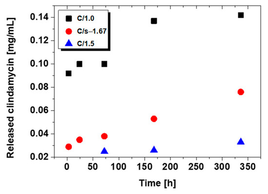 The amount of clindamycin in mg/mL released from the powder samples is presented in Figure 6.