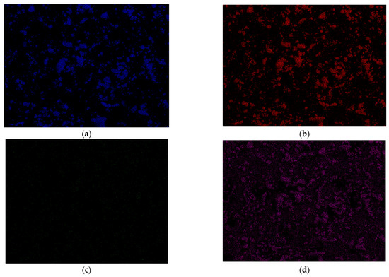 In the case of Ca and P (blue and red colors), overlapping elemental maps were observed. This is due to the connections between these elements in the structure of calcium phosphates. Small green signals from chlorine were observed, distributed fairly parallel across the entire volume of the test powder. This suggests an effective drug modification and confirms the presence of the antibiotic in the ceramics.