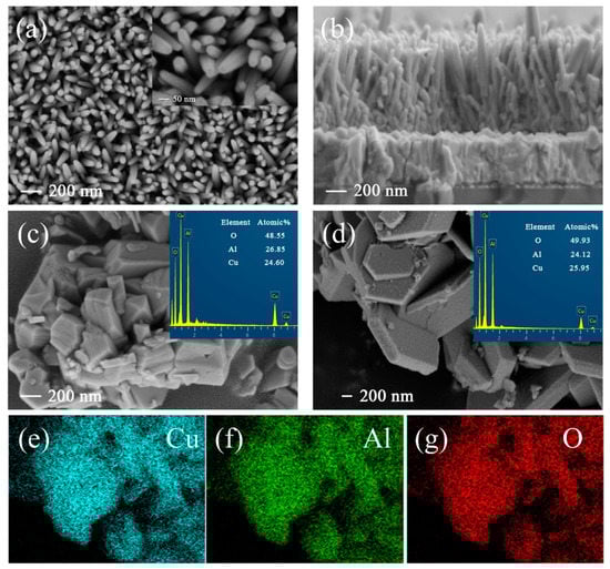 Figure 1 displays the morphological analysis of ZnO NRs, CuAlO2, and typical CuAlO2/Cu–O powders. From the top-view and cross-sectional SEM images of ZnO NRs, one can see that vertically grown nanorod arrays with a diameter of ~50 nm (Figure 1a) and an average thickness of about 850 nm distribute uniformly on the FTO substrates (Figure 1b). This optical trapping structure of nanorods can improve the absorption of ultraviolet light [42]. Figure 1c shows the SEM and EDS results of the pure CuAlO2 sample, which is uniform, compact, and smooth with particle sizes of 200–400 nm. This polygonal grain shape suggests that the treatment process, such as sonication, does not alter its crystallinity [39]. The illustration in Figure 1c reveals that the elemental percentages of Cu (~24.60 at.%), Al (~26.85 at.%), and O (~48.55 at.%) match well with the stoichiometric proportion of pure CuAlO2. In Figure 1d, Cu–O incorporation into CuAlO2 obviously enhances the grain size (400–600 nm). The CuAlO2/Cu–O is rough and flaky with randomly grown minor crystallites. This flaky particle is beneficial for the improvement of the conductivity of CuAlO2, as reported by other researchers [43]. It can be found that the atomic ratio of Al decreases with the incorporation of Cu–O clusters. Elemental mapping of CuAlO2/Cu–O (Figure 1e–g) reveals that the film is mainly composed of Cu, Al, and O, which distribute homogeneously in the sample.