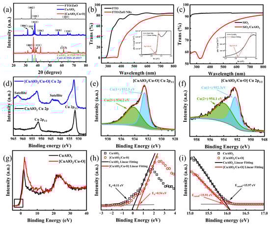 (a) XRD patterns of ZnO, CuAlO2, and [CuAlO2/Cu–O], (b) UV–vis spectra of FTO and FTO/ZnO NRs (inset showing the Tauc plot of ZnO NRs), (c) UV–vis spectra of SiO2 and SiO2/CuAlO2 (inset showing the Tauc plot of CuAlO2), (d) Cu 2p XPS spectra of CuAlO2 and [CuAlO2/Cu–O], (e) Cu 2p3/2 and (f) Cu 2p1/2 of [CuAlO2/Cu–O], (g) XPS wide valence-band spectra of CuAlO2 and [CuAlO2/Cu–O] and (h) their particular XPS wide valence-band spectra, (i) UPS spectra of CuAlO2 and [CuAlO2/Cu–O].