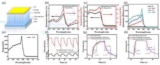 where λ is the radiation wavelength, c is the speed of light, and h is the Planck constant. The response wavelength range is from 320 to 440 nm and the peak responsivity is found at 370–380 nm, which correlates well with the high optical absorptance lower than 400 nm wavelength. The device is visible–blind ultraviolet detection, which is consistent with the results of transmittance spectra. The peak responsivity of the ZnO/[CuAlO2/Cu–O] photodetector is about 91.3 mA/W, higher than the 13.2 mA/W of ZnO/CuAlO2 photodetector, indicating that the incorporation of Cu2+ significantly improves the performance of the device. It is ascribed to the increase in the photocurrent, as more carriers are collected under illumination after the incorporation of Cu2+ in the CuAlO2 thin films. The maximum responsivity reveals the high capability to detect UV signals and the presence of internal gain in the device. The related UV-to-visible rejection ratio (375–440 nm) of the devices is about 75, which confirms the UV spectrum selectivity. This is attributed to the wide bandgap of the ZnO (~3.25 eV) and the CuAlO2 (~3.11 eV) semiconductors, which leads to a dramatic increase in UV light absorption in the active material of the device. There is no significant change in the quantum efficiency for wavelengths higher than 400 nm, which may be related to the reduction in photogenerated carrier due to the decrease in the optical absorptance of ZnO [47]. After applied bias voltage, the photoresponsivity for the photodetector increases up to 5002 mA/W at −1.5 V under 375 nm wavelength (Figure 3d,e). This enhancement is attributed to the fact that applying a negative bias can enhance the width of built-in electric field, which leads to separate photogenerated carriers more effectively. In short, the ZnO/[CuAlO2/Cu–O] detectors deliver the high performance in the UV–A region.
