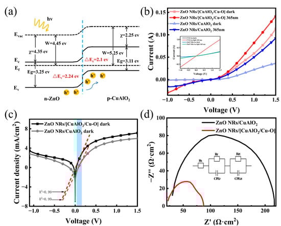(a) Energy band diagram of the ZnO NRs/CuAO2 heterojunction, (b) I–V curves of ZnO NRs/CuAlO2 and ZnO NRs/[CuAlO2/Cu–O] devices in the dark and upon 365 nm light (I–V curves of FTO/Au and FTO/ZnO NRs/Au inside), (c) the plot of lnJ vs. V in the dark, (d) EIS spectra of the ZnO NRs/CuAlO2 and ZnO NRs/[CuAlO2/Cu–O] devices.