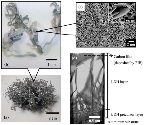 The macroscopic and microscopic views of the LDH/Al adsorbent material: (a) a photograph of industrial aluminum lathe waste (weight of 5 g), which would be employed as the substrates for the formation of Li–Al–CO3 LDH; (b) a photograph of some aluminum lathe waste strips after being coated with Li–Al–CO3 LDH, in which (c) SEM surface morphologies of the LDH are shown; and (d) TEM cross-sectional view of the LDH.
