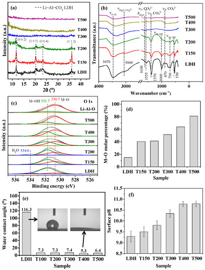 Surface characterization of LDH and calcined LDH with various calcination temperatures: (a) XRD patterns; (b) FTIR spectra; (c) O 1s XPS spectra; (d) M–O/M–OH molar percentage; (e) water contact angle; and (f) surface pH.