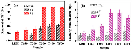 (a) Ni2+ removal efficiencies of LDH, T150, T200, T300, T400, and T500 from initial 75 mg/L Ni2+ aqueous solutions, indicating that using 2 g LDH/Al exhibits much better removal efficiencies than 1 g LDH/Al; (b) leaching concentrations of Li+ and Al3+ from the LDH, T150, T200, T300, T400, and T500 after Ni2+ removal experiments in aqueous solutions with initial 75 mg/L Ni2+. The time was 60 min for the Ni2+ removal experiments.