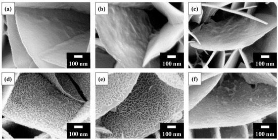 SEM surface morphologies after the recovery of Ni2+ for 1 min using (a) LDH and calcined LDH of: (b) T150; (c) T200; (d) T300; EUR T400; and (f) T500. As shown in (d,e), nanofilaments were observed on the platelet surface, especially T400 (as revealed in (e)). The initial Ni2+ concentration for the experiments was 75 mg/L.