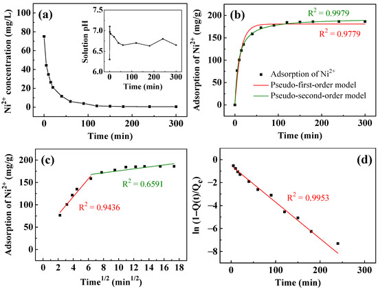 (a) The removal of Ni2+ and pH change (inset) as a function of time using T400. Kinetic fitting curves simulated by: (b) pseudo-first-order and pseudo-second-order; (c) intraparticle diffusion; and (d) liquid film diffusion models. The adsorbent dosage of T400 for this experiment was 0.4 g/L.