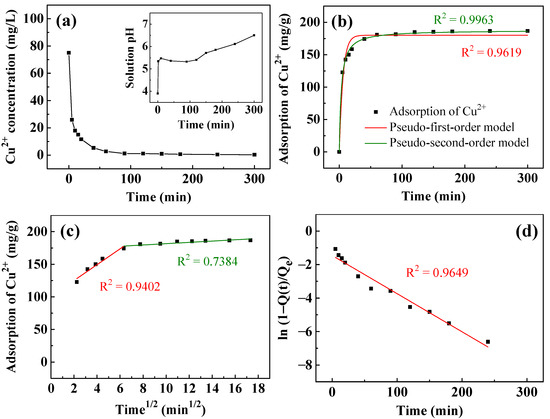 Figure 6 presents the adsorption kinetics of Cu2+ removal by T400. Figure 6a plots the Cu2+ concentration against time. The concentration of Cu2+ decreased rapidly within the first 5 min from the initial 75 mg/L to ~25.9 mg/L. Subsequently, it decreased relatively slowly to ~3 mg/L at 60 min and 0.3 mg/L at 300 min. The inset in Figure 6a plots the solution pH during Cu2+ removal. The initial solution pH was ~3.9. As the T400 came into contact with the aqueous solution, the solution pH rose rapidly to 5.4 and remained between 5.3 and 5.5 for 120 min. Between 120 and 300 min, the solution pH increased linearly with time from 5.4 to 6.5. Figure 6b–d plot fitted curves for the kinetics of the adsorption of Cu2+. As shown in Figure 6b, the pseudo-second-order model fits the experimental data better than the pseudo-first-order model. The liquid film diffusion model in Figure 6d fits better than the intraparticle diffusion model in Figure 6c, with an R2 of 0.9649 and a small y-intercept of −1.46, indicating that liquid film diffusion is the rate-controlling step.